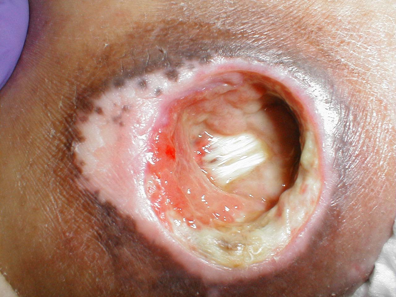 Clean the wound with mild soap and water every day. It will remove the dead skin tissue and drainage from the affected area.